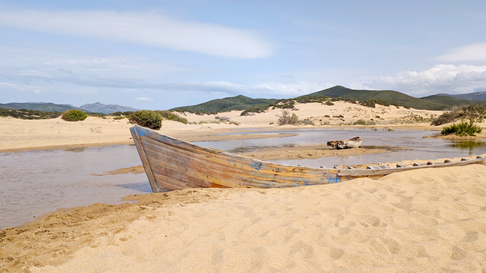 Un peu plus au sud, route pour la plage di Piscinas, une plage qui se mérite, car sa route d’accès est étroite et bien sinueuse, elle descend dans une vallée où subsistent les bâtiments et machines abandonnés d’un village minier du XIXe siècle. Les cinq derniers km sur une piste bien abîmée. La plage de Piscinas est un large ruban de sable, bordée par une longue ligne de dunes parsemées d’un maquis. Les dunes, nommées d&ecute;sert sarde, atteignent par endroits 50 m de haut. Nous ne resterons pas la nuit, car la pluie est annoncée et le parking sur du sable, je n’ai pas trop envie de rester planté !