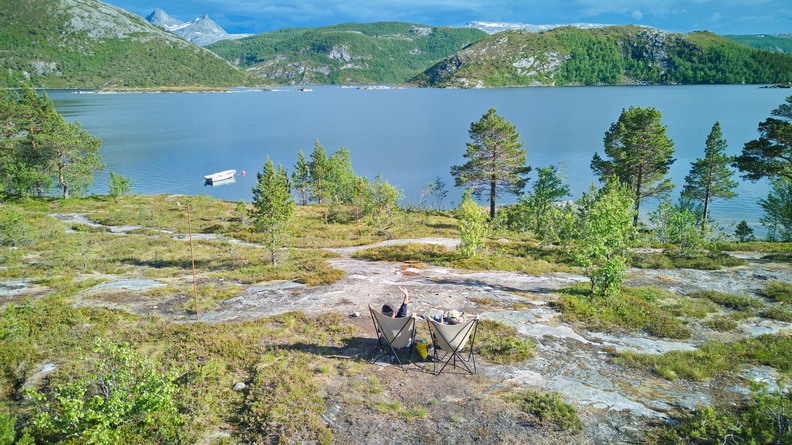Beaucoup de monde pour le ferry de Nesna, 1 h 30 d’attente. Étape au bord du fjord, il fait bon, on en profite pour un moment de détente, fauteuils et apéro au soleil.